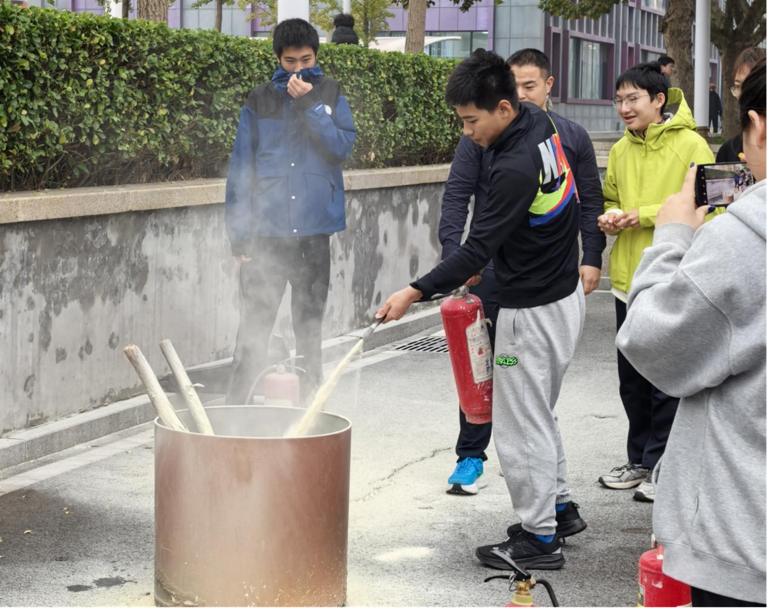 演練最后設(shè)置了消防器材實操環(huán)節(jié)。保衛(wèi)處消防干事現(xiàn)場講解了滅火器的種類與正確使用方法,并指導(dǎo)師生代表進(jìn)行實際操作。通過親身體驗,師生們不僅鞏固了消防知識,更提升了在緊急情況下的實戰(zhàn)能力。