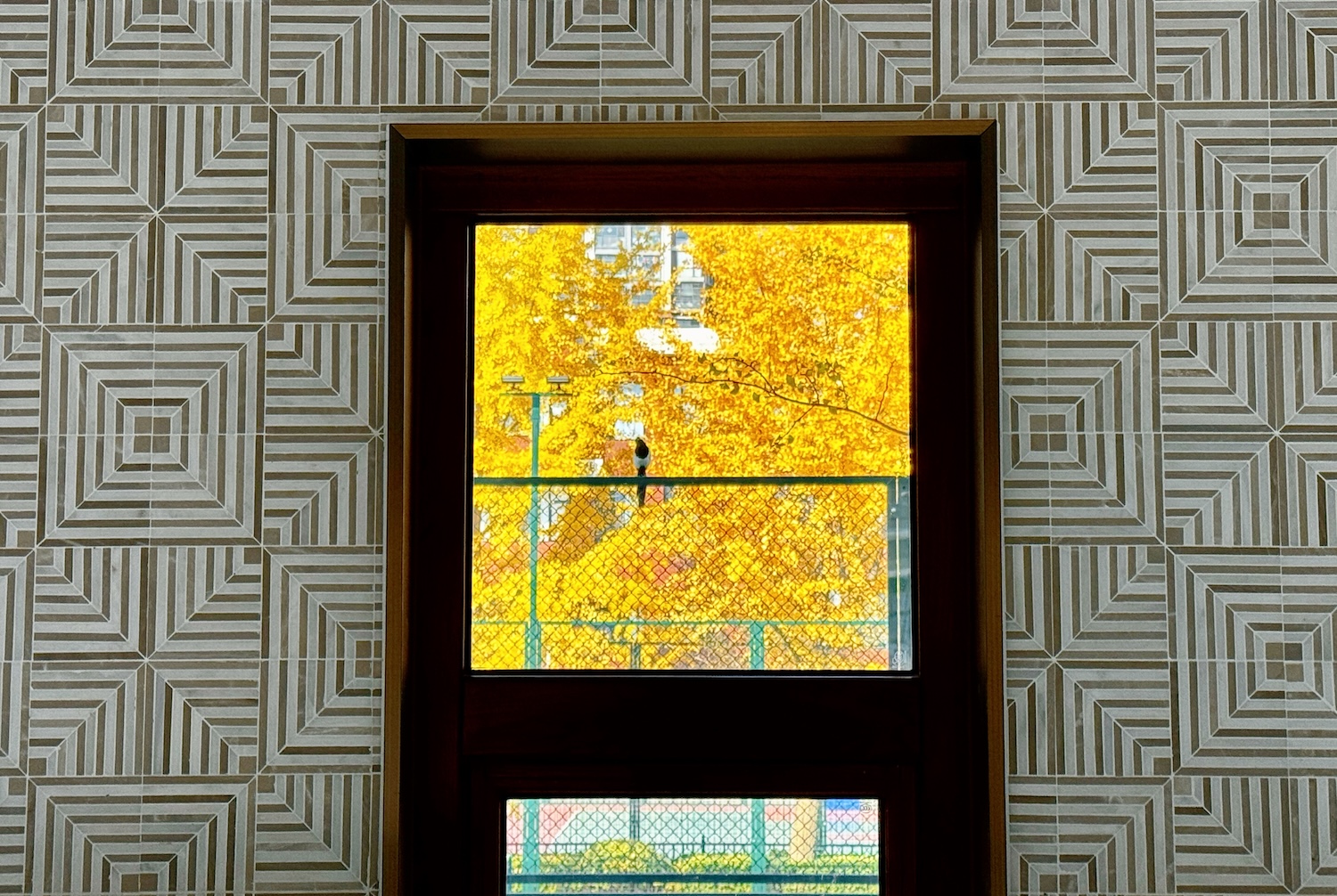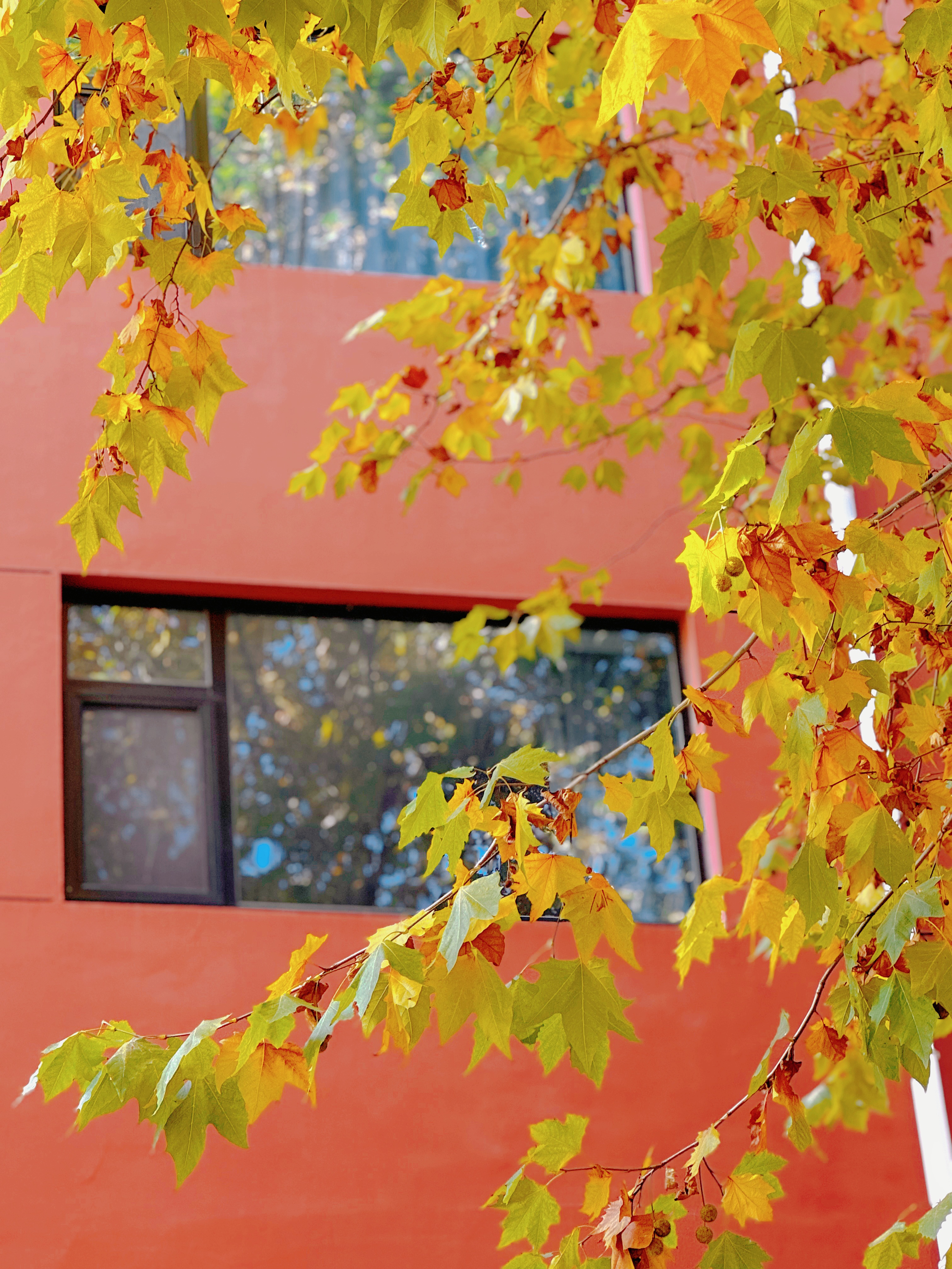 樓前枝頭被秋色浸染,陽光與樹影在靜默中作畫,將一方天地定格為永恒的詩篇。